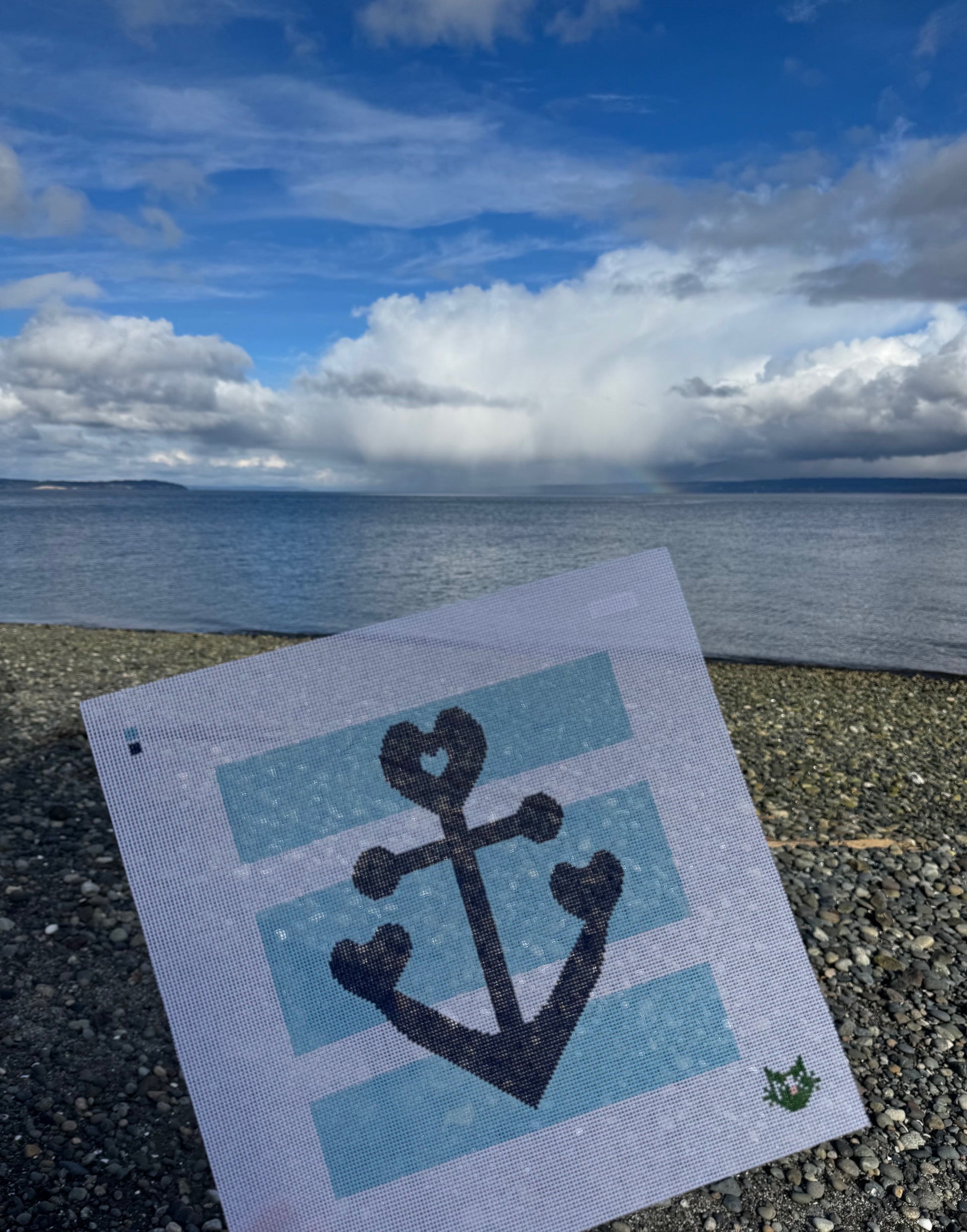 This original design features artwork by Lindsey Noel for MadKat Needlepoint, a hand-painted canvas featuring our signature heart anchor with a crisp blue stripe background. Perfect for beginners!